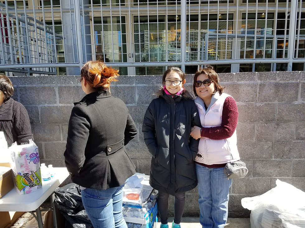 [음식 서빙 중에 잠깐 틈을 내어 처음으로 홈리스 섬김사역에 따라나선 Jessica Chung 학생과 함께 한 EM 사랑방 식구 Hannah Kim]